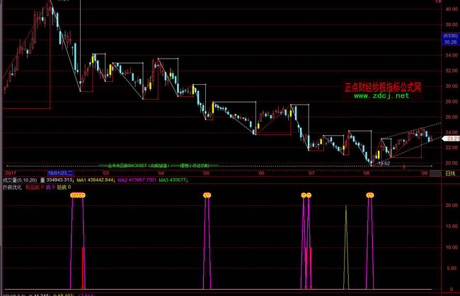 底:IF((MA(C,5)-C)/C>0.03 AND (MA(C,10)-MA(C,5))/MA(C,5)>0.03,23,0),LINETHICK2,COLORFF00FF;