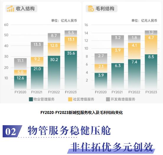 報告期內,新城悅服務物業管理服務增勢強勁,收入同比增長17.5%升至35.6億元,總收入占比約65.6%,穩健壓艙;基礎物管服務業績的快速提升與管理規模的高質增長相得益彰——公司秉承有基礎、有市場、有能力的“三有”原則,不斷強化城市聚焦,擇優進行市場拓展,持續推動當地市場口碑與項目服務密度的雙向提升。2023年,新城悅服務的在管面積約為2.24億平方米,同比增長12.8%,其中源自第三方的在管面積占比幾乎“過半”約為48.9%。