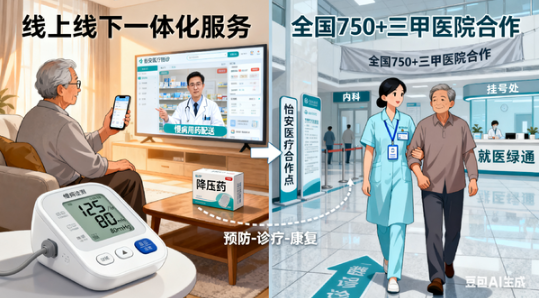醫(yī)療級服務需要覆蓋從預防、診療到康復的完整鏈條。怡安醫(yī)療已對接全國750多家三甲醫(yī)院,可提供就醫(yī)綠通、陪診等線下服務;同時配備線上藥房、慢病管理等功能模塊,實現(xiàn)了線上線下一體化。
