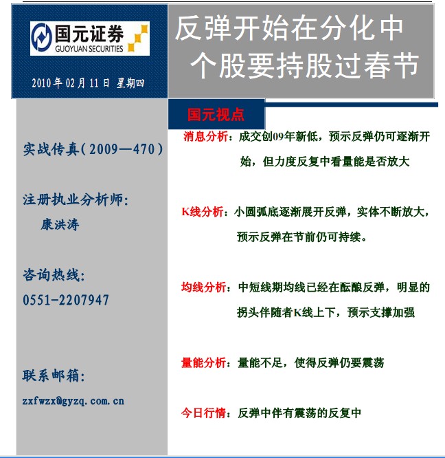 量能是決定高度的絕對指標 盡管大盤展開反彈,但市場熱點依舊零散,個股上漲家數雖多,但漲停個股卻僅有5只,漲幅居前的個股缺乏明顯的板塊聯動效應,充分體現市場人氣的低靡,正如我們前期所分析的,隨著海南板塊的回落,市場對于區域概念的炒作和發掘開始向內陸地區轉移,受益湘潭城市總體規劃獲批的湖南投資、湘潭電化,以西安飲食、交大博通為代表的關中天水經濟區, 武漢城市圈中的東湖高新、武漢塑料,雖然無法形成類似海南板塊的聯動效應和延續性,但在目前市場交投清淡的背景下,還是一絲亮色。大盤藍籌股整體反彈,銀行、保險、券商全盤飄紅,煤炭、有色、地產也大部分上漲,但缺乏量能配合,力度有限。 從今天的盤口動向來看,股指高開之后震蕩回落,量能逐步萎縮,說明市場買盤不夠積極,但連續下跌后殺跌動能也不足,多空雙方處于膠著狀態。從中登公司最新統計來看,A 股開戶數創近四周新低、持倉帳戶再創新高表明市場主力仍在派發籌碼,這對行情極為不利,缺乏承接盤主力做多心有余而力不足,只能通過尾盤.......