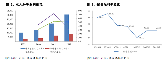 1.業(yè)績符合預期,注意所得稅及政府補貼影響。公司此次公告12年業(yè)績增長31.4%,我們之前預計的全年增速30.1%,業(yè)績符合預期。公司四季度單季營業(yè)收入增加2倍,凈利潤增約32%。值得注意的是公司2011年1-8 月所得稅率25%,2012年因為獲得高新技術(shù)企業(yè)資質(zhì)所得稅率降至15%。我們預測公司2012年獲得政府補助約1200萬,剔除所得稅和政府補助影響之后,預計公司12年業(yè)績實際同比增速約20%。