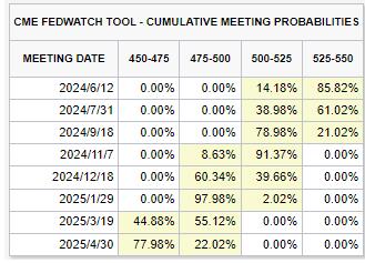 然而,鮑威爾主席也排除了在下次會議上降息的可能性,這意味著美聯(lián)儲首次降息可能要等到今年的 9 月或 12 月才有可能發(fā)生。與此同時,鮑威爾主席在記者會上也未明確表示今年是否會降息,也沒有表示利率已達到峰值,并且強調了聯(lián)準會的政治獨立性,不受其他因素如美國總統(tǒng)大選等的影響利率決策與貨幣政策。從利率市場可以得知,目前市場預期最快11月份美聯(lián)儲降息的機會最大。