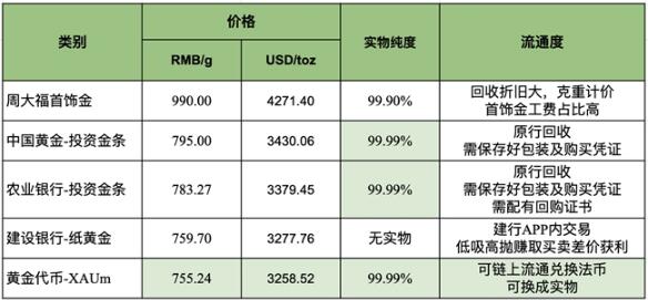 市面上黃金投資種類眾多,從紙黃金、投資金條、首飾金到基于區塊鏈技術的黃金代幣,種類繁多的黃金投資品該怎么選?下圖盤點了市面上的主題黃金投資標的,從價格、實物純度以及流動等領域為大家做直觀展示。
